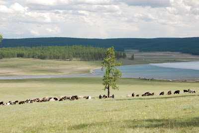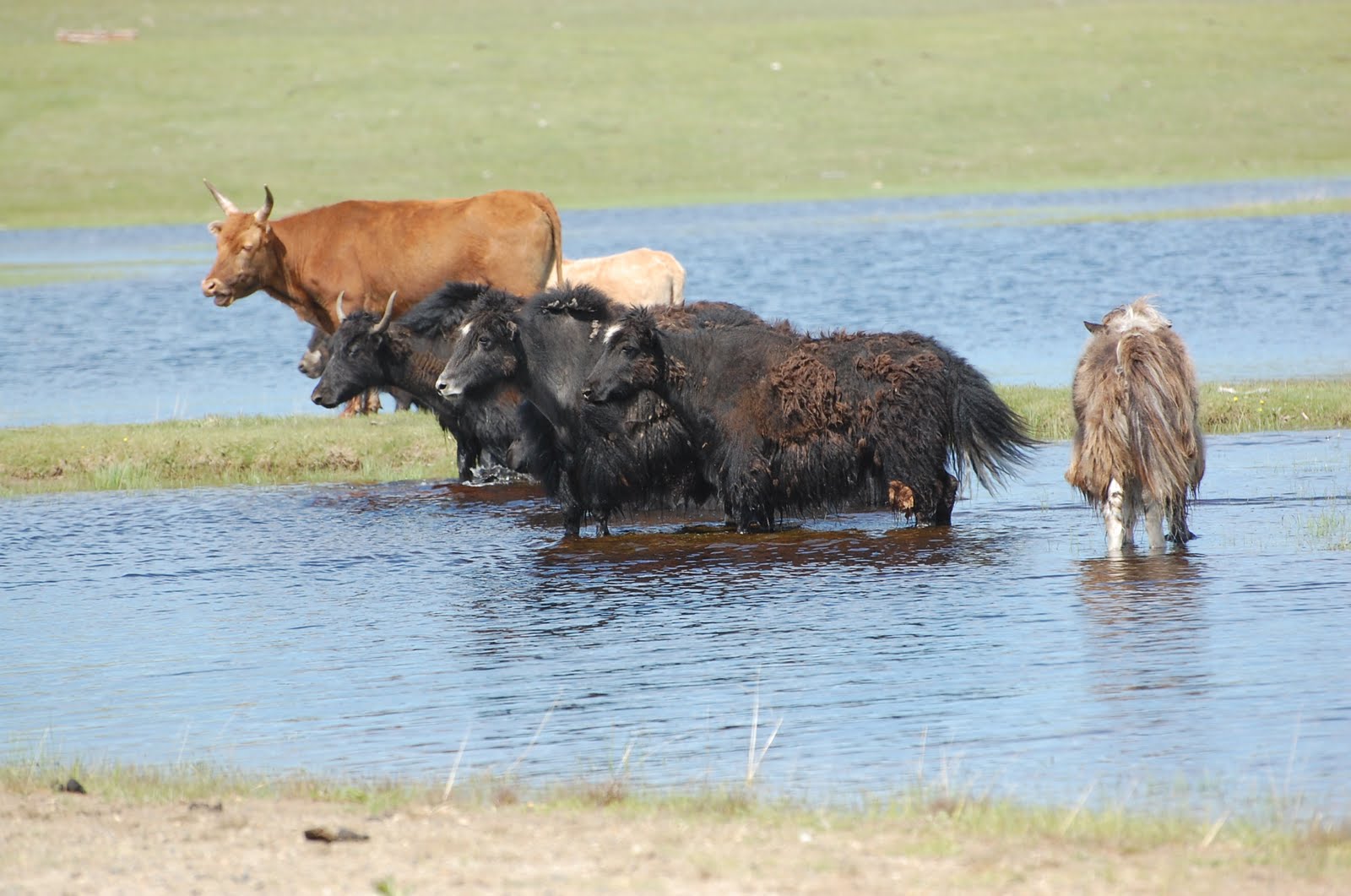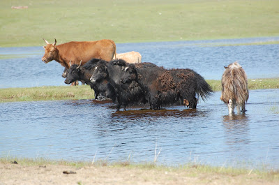 Weitr geht es, die Landschaft bietet dauernd neue Ausblicke. Die Herden sind gemischt, Rinder und Yaks mit ihren Jungen. Die Herden müssen von einem Weideort an einen anderen "gebracht" werden! Man begleitet die Herde und dirigiert mit gutturalen Lauten, die man erst ein wenig üben muss und die man schriftlich nicht wiedergeben kann!!