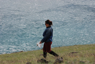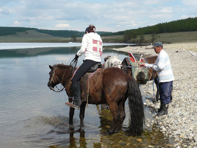 Aufstehen in der Frühe, -husch husch Katzenwäsche, -es ist merklich kühl!! Frühstück "de luxe": gesalzener Tee mit Milch und Keksen :-( dann die Pferde (zu Fuss natürlich) von der Koppel holen- und los geht es. Der See ist an manchen Stellen noch mit Eis bedeckt.