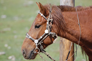 | Die Kopfstücke und Halfter sind, genau wie bei den "Westernreitern" Amerikas mit Silberapplikationen verziert. (hier könnte es sich aber nur um "white metal" handeln!) |